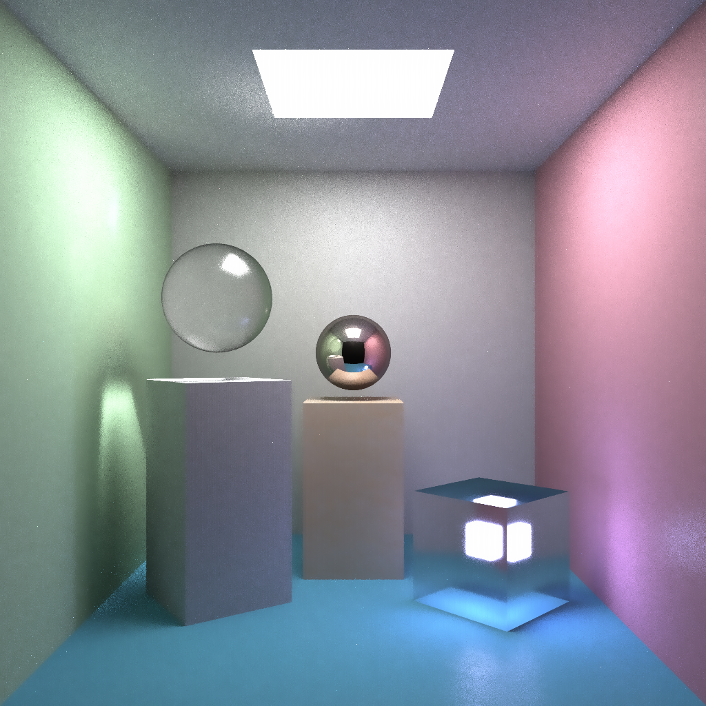 - Including features like physically based rendering, nested dielectrics, reflection and refraction, area lights, multiple importance sampling, BVH acceleration, sky box, de-noising, anti-aliasing, etc.